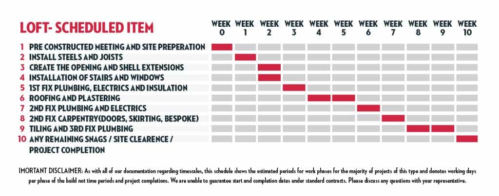 Wherever possible we bend, break and swap these phases to suit the circumstances. So, for example, if you’re expecting a baby mid-way through the build we will often focus on the structural works and making the loft weather tight to meet that due date, leaving all the internal works (and less noisy parts) for after the birth. This is why our clients give us great feedback and why we personalise our service. Take a look at the standard phase plan and remember upon your home consultation we will discuss what your own phase plan will look like.